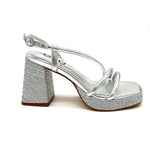 The Cleopatra Sandal from Exe features a strappy metallic upper and a textile wrapped platform outsole.