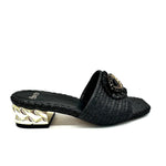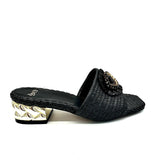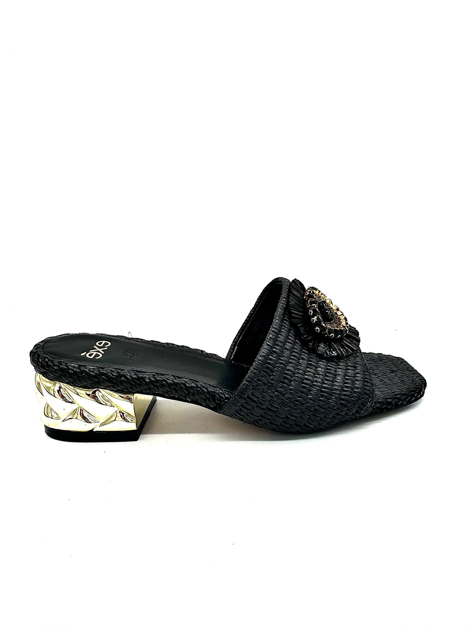 The Katy Sandal from Exe features a low heel, raffia upper, and “evil eye” rhinestone detailing.