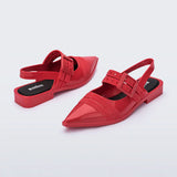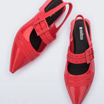 red pointed toe sling back ballerina flat with adjustable buckle front strap and bubblegum scent profile