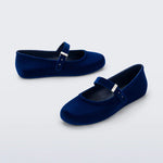 Melissa Soft Ballerina Velvet flat in deep blue. This classic women's ballet flat features a flocked finish, mimicking velvet, a fun bubblegum scent, adjustable buckle strap, an rounded toe front back pair