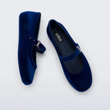 Melissa Soft Ballerina Velvet flat in deep blue. This classic women's ballet flat features a flocked finish, mimicking velvet, a fun bubblegum scent, adjustable buckle strap, an rounded toe top side profile.