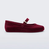 Melissa Soft Ballerina Velvet flat in red. Classic women's ballet flat features flocked finish, mimicking velvet, a fun bubblegum scent, adjustable buckle strap, and rounded toe side profile