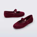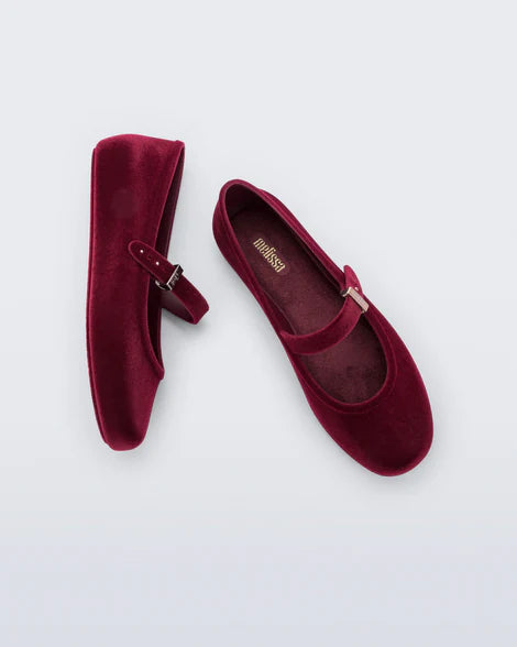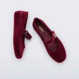 Melissa Soft Ballerina Velvet flat in red. Classic women's ballet flat features flocked finish, mimicking velvet, a fun bubblegum scent, adjustable buckle strap, and rounded toe front back pair