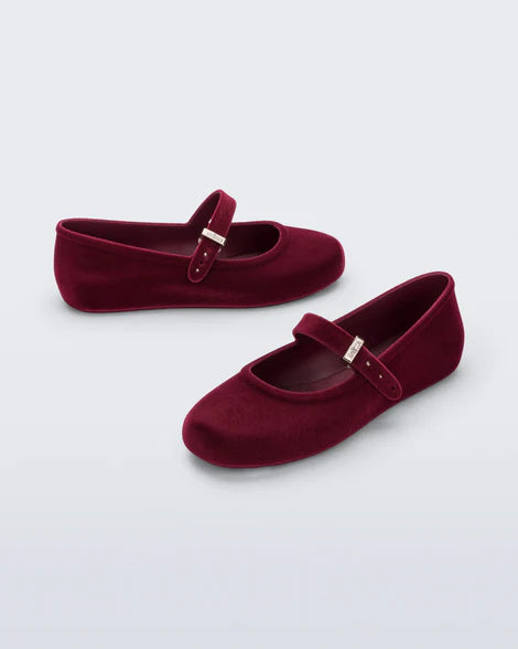 Step into sophistication with the Melissa Soft Ballerina Velvet flat in red. This classic women's ballet flat silhouette meets the luxurious touch of a flocked finish, mimicking velvet and a fun bubblegum scent. Slip into this season's must-have ballet flat, blending timeless charm with a touch of something new, for a ballet flat experience that's truly enchanting.