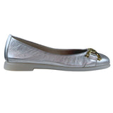 Silver ballet flat with gold colored detailing on the toe. A fabulous flat to add a little shimmer to any outfit.
