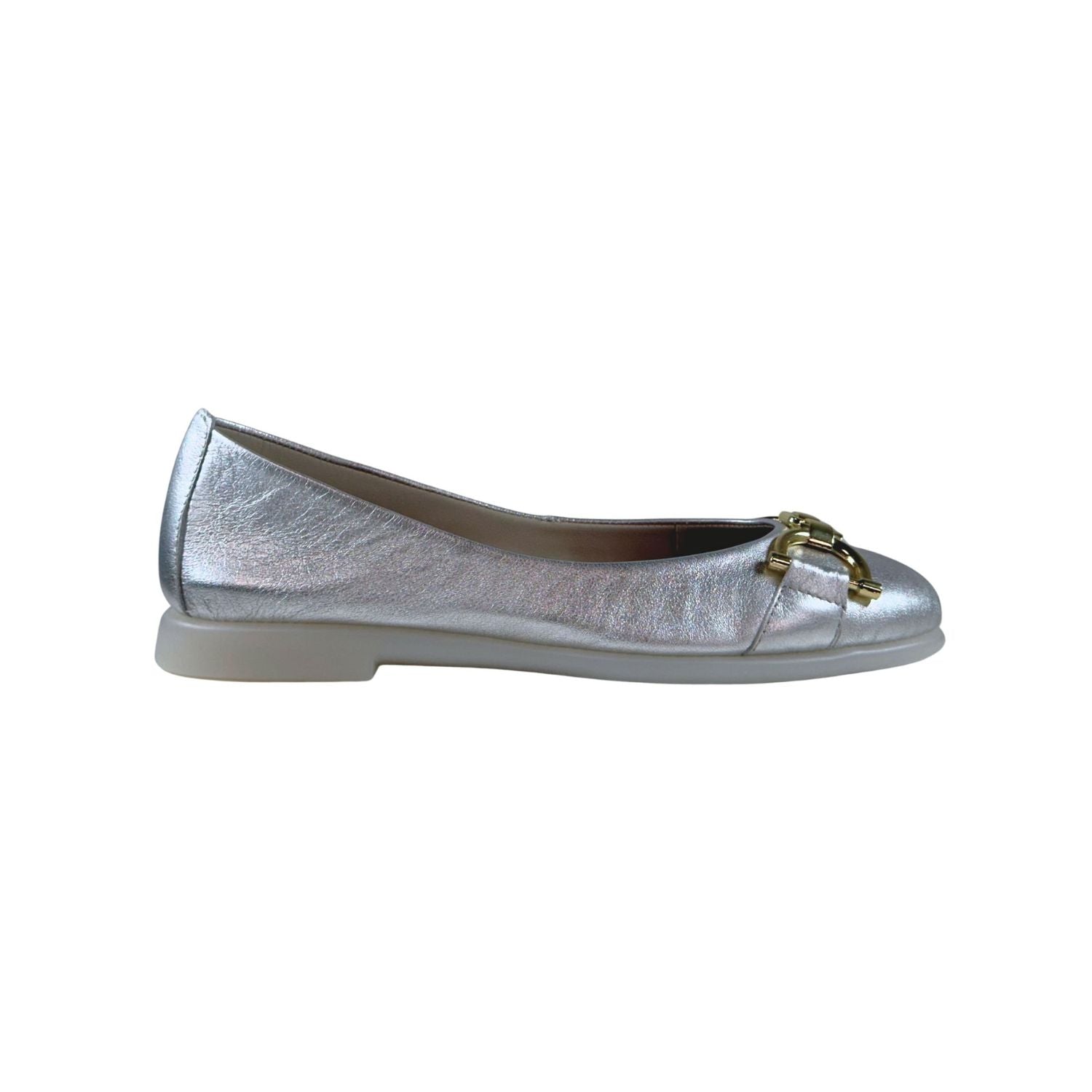 Silver flat shoe with a gold buckle on a white background
