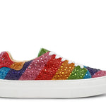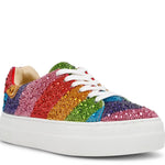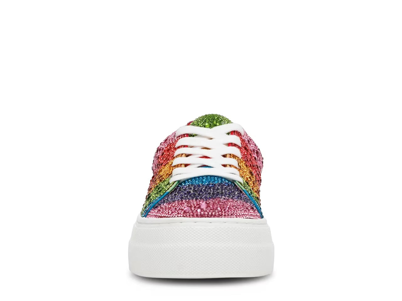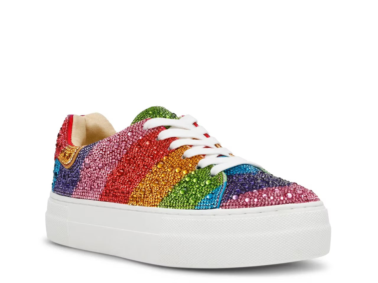 Exude rockstar vibes in the Suton Highwall Bling platform sneaker from Betsey Johnson. This sneaker features a rhinestone-embellished upper and a low platform heel for a trendy touch.