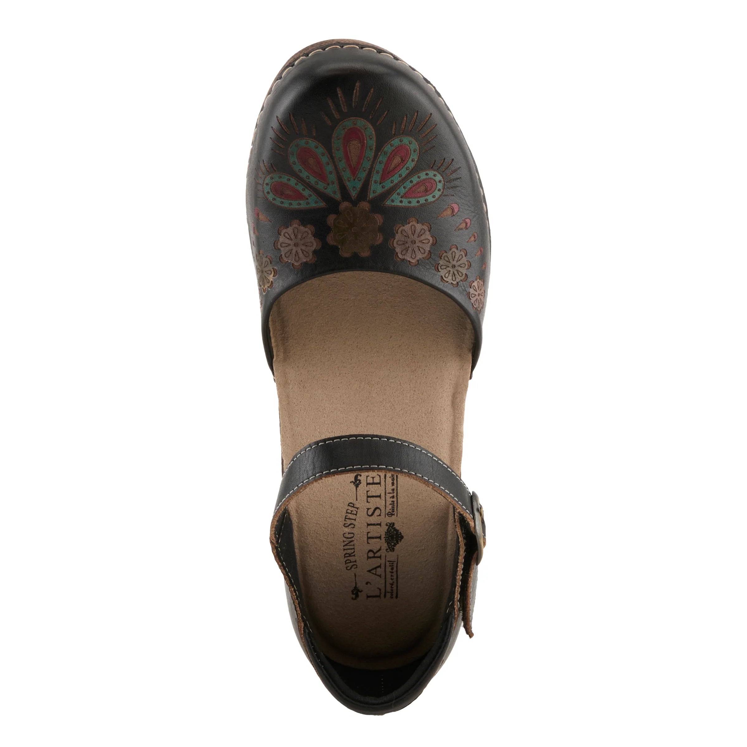 Embrace boho-chic sophistication with this artfully crafted leather Mary Jane. The hand-painted floral and paisley-inspired design radiates an artistic charm, while the subtle floral etching on the heel adds a unique touch. Featuring an adjustable hook-and-loop closure for a personalized fit, this shoe ensures both style and all-day comfort. A plush insole cradles your feet, making every step a dream. Whether dressing up or keeping it casual, this modern-meets-vintage silhouette brings effortless elegance and comfort to your wardrobe.
